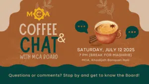 Each of MCA’s Boards meets bi-weekly and posts its minutes monthly on the board outside of Khadijah Banquet Hall. MCA members are welcome to observe the meetings. Join the Coffee & Chat with The MCA Board this Saturday, July 12th at 7pm and get to know the Board that serves you!