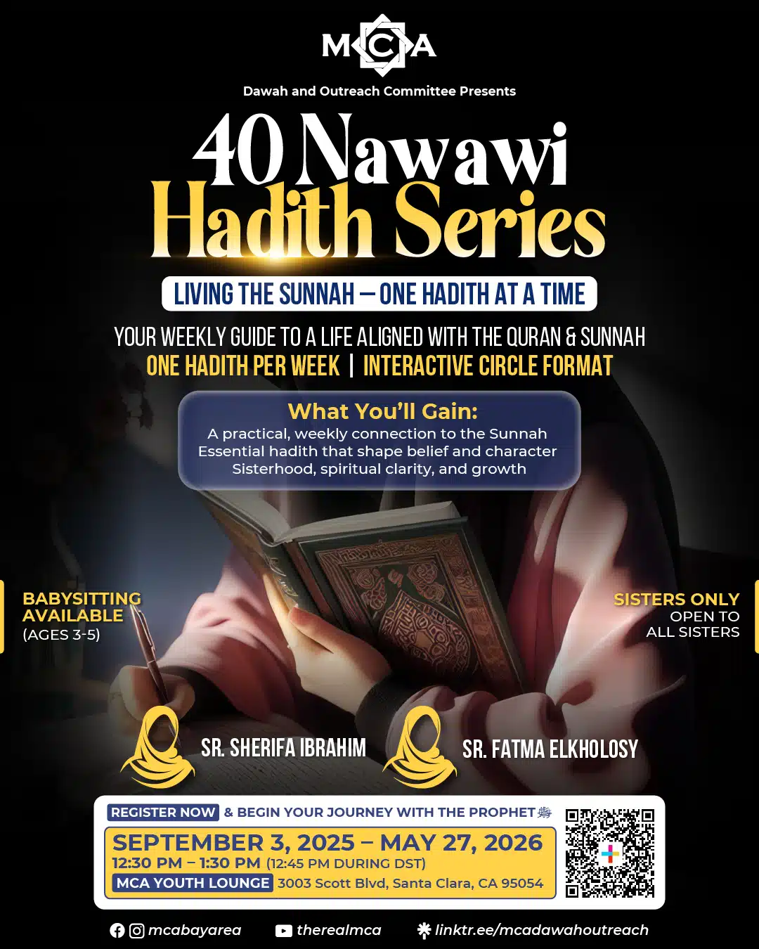 Join us for a soul-nourishing weekly sisters’ program covering the Forty Hadith of Imam An-Nawawi — taught in an interactive circle format by 2025 Ijazah graduates of Shaykha Shereen.