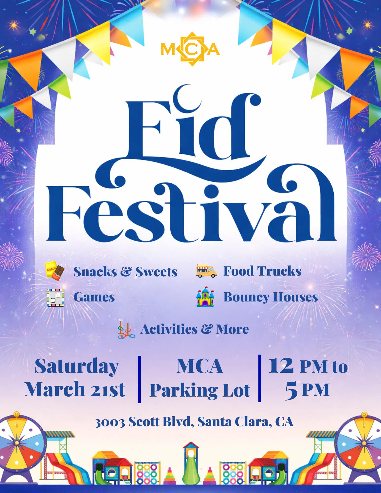 Join us for the MCA Eid Festival this Saturday for an evening of fun, food, and celebration with the community! Bring your family and friends to enjoy games, activities, delicious food, and festive entertainment as we celebrate Eid together. We look forward to seeing you there!