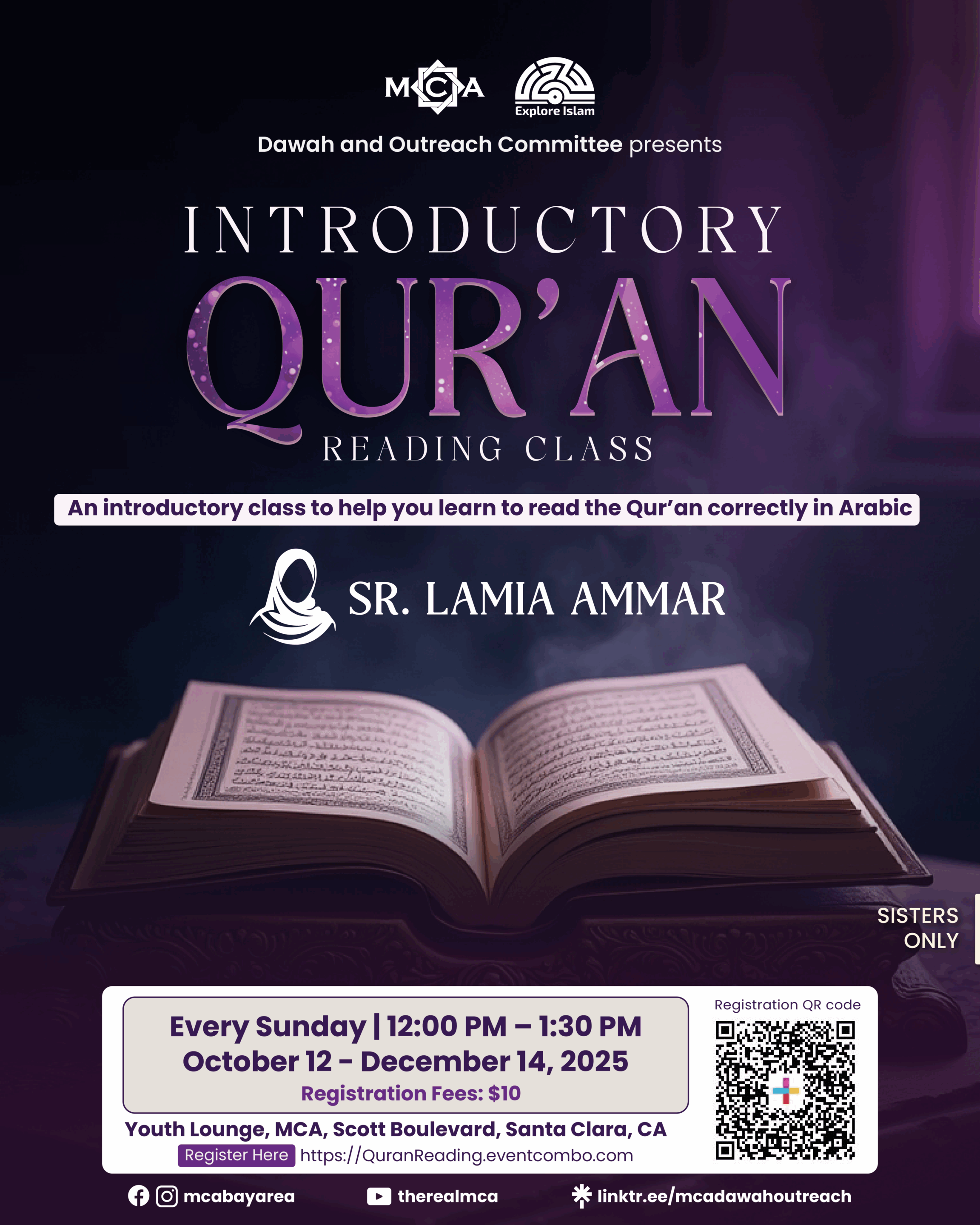 This beginner-friendly class is open to sisters with no prior knowledge of Arabic. It aims to help you learn to read the Qur’an correctly in Arabic through step-by-step instruction and guided practice.
