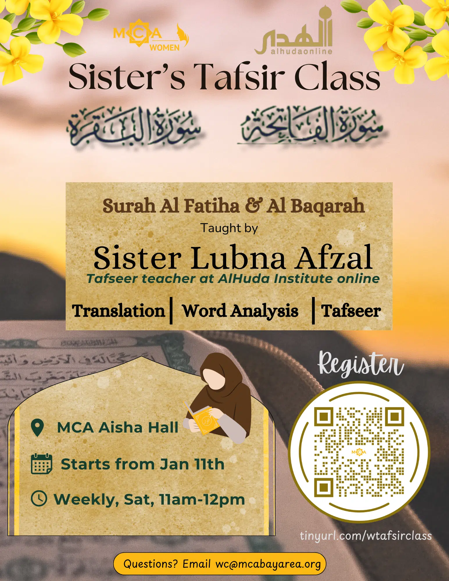 This weekly tafsir class that will cover translation, word-by-word analysis and tafsir of Surah Fatiha and Surah Baqarah.