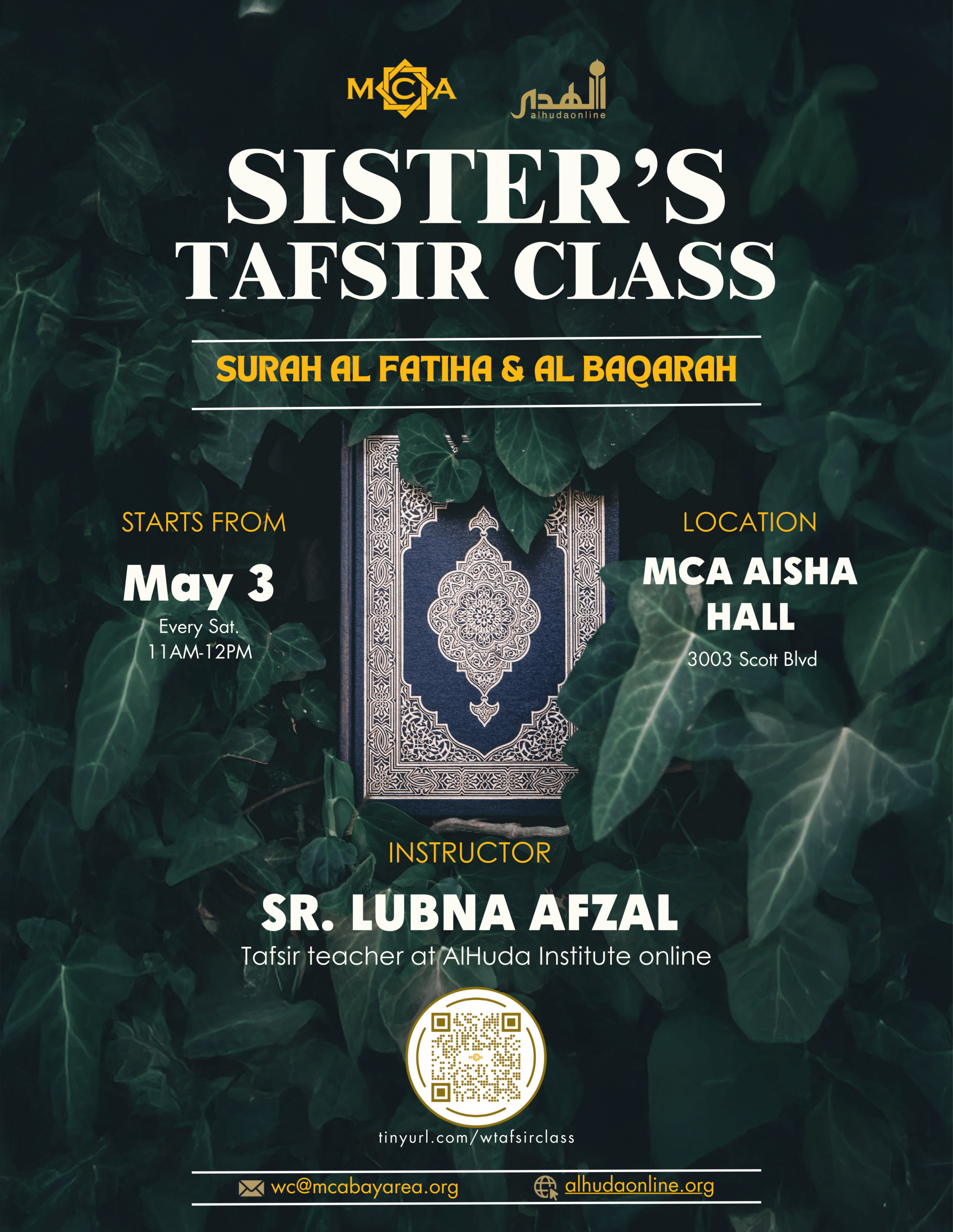 Join our weekly tafsir class with AlHuda instructor Sr. Lubna Afzal to study the opening chapters of the Quran. Students will embark on a translation, word-by-word analysis and tafsir that will foster a greater understanding and love for the surahs. Great for busy sisters and beginners!
