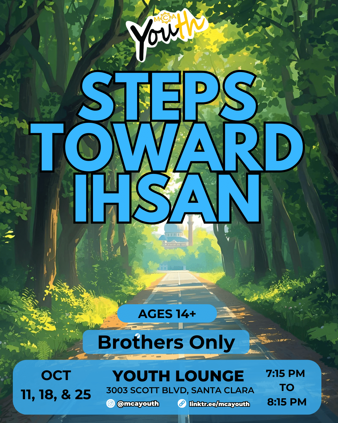 oin us for Steps Toward Ihsan, a transformative halaqa series for brothers aged 14–35, focused on nurturing excellence in faith, character, and action. Through interactive discussions and spiritual reflections, we’ll learn how to embody sincerity, discipline, and purpose in every step of our daily lives—striving for Ihsan in our relationship with Allah and others.