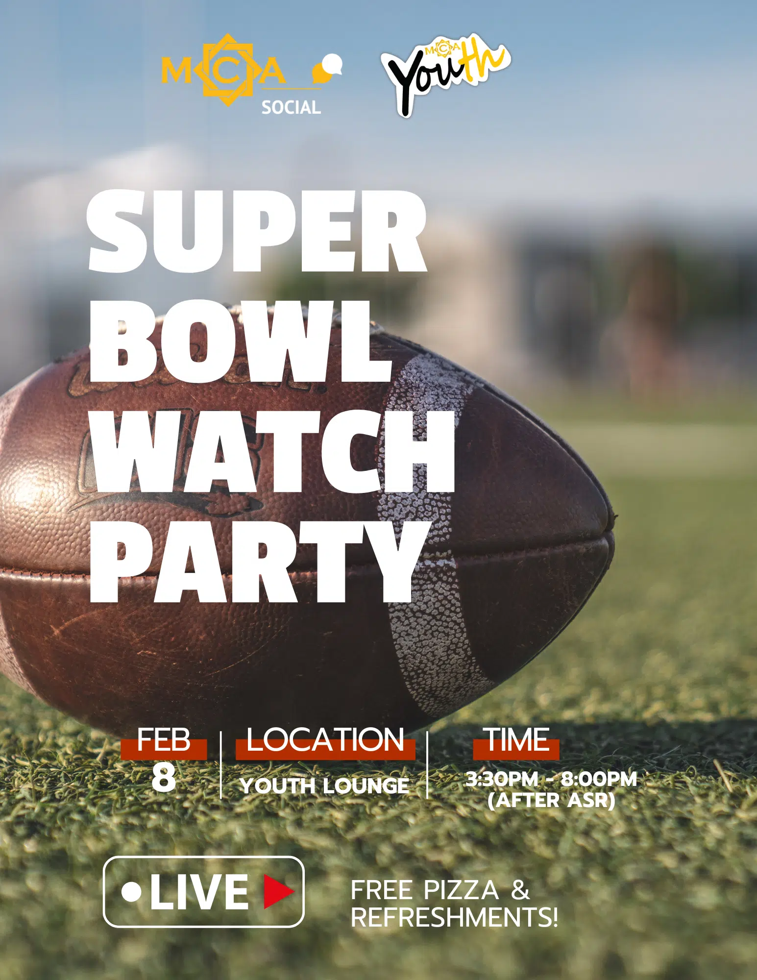 Join MCA Social x MCA Youth for an exciting Super Bowl Watch Party — bring your friends and enjoy the game together with Live game screening & FREE pizza & refreshments!!
