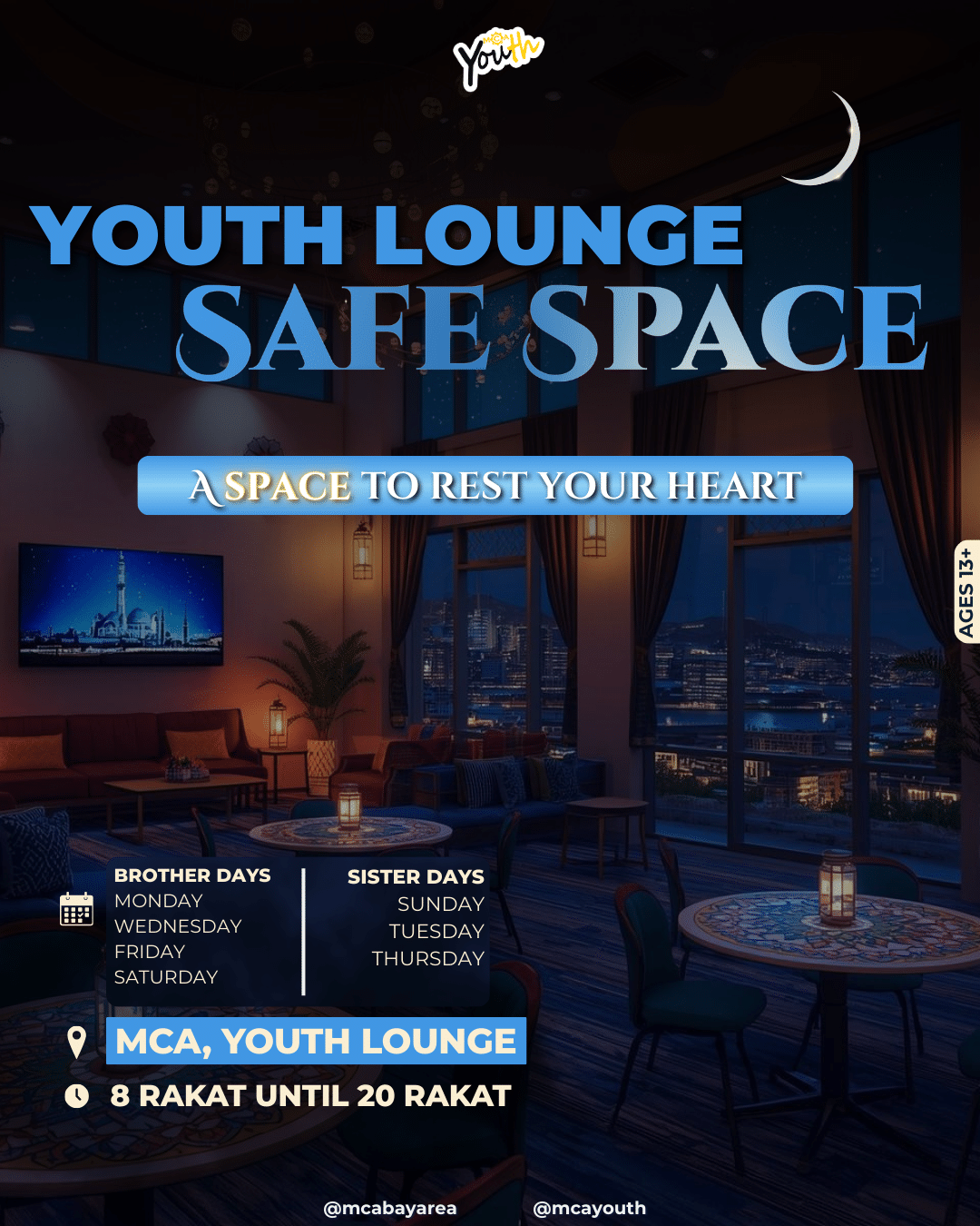 Looking for a safe, welcoming place to spend time after Taraweeh? Join us at the MCA Youth Lounge (YL) every night after 8 rak‘at during Ramadan!