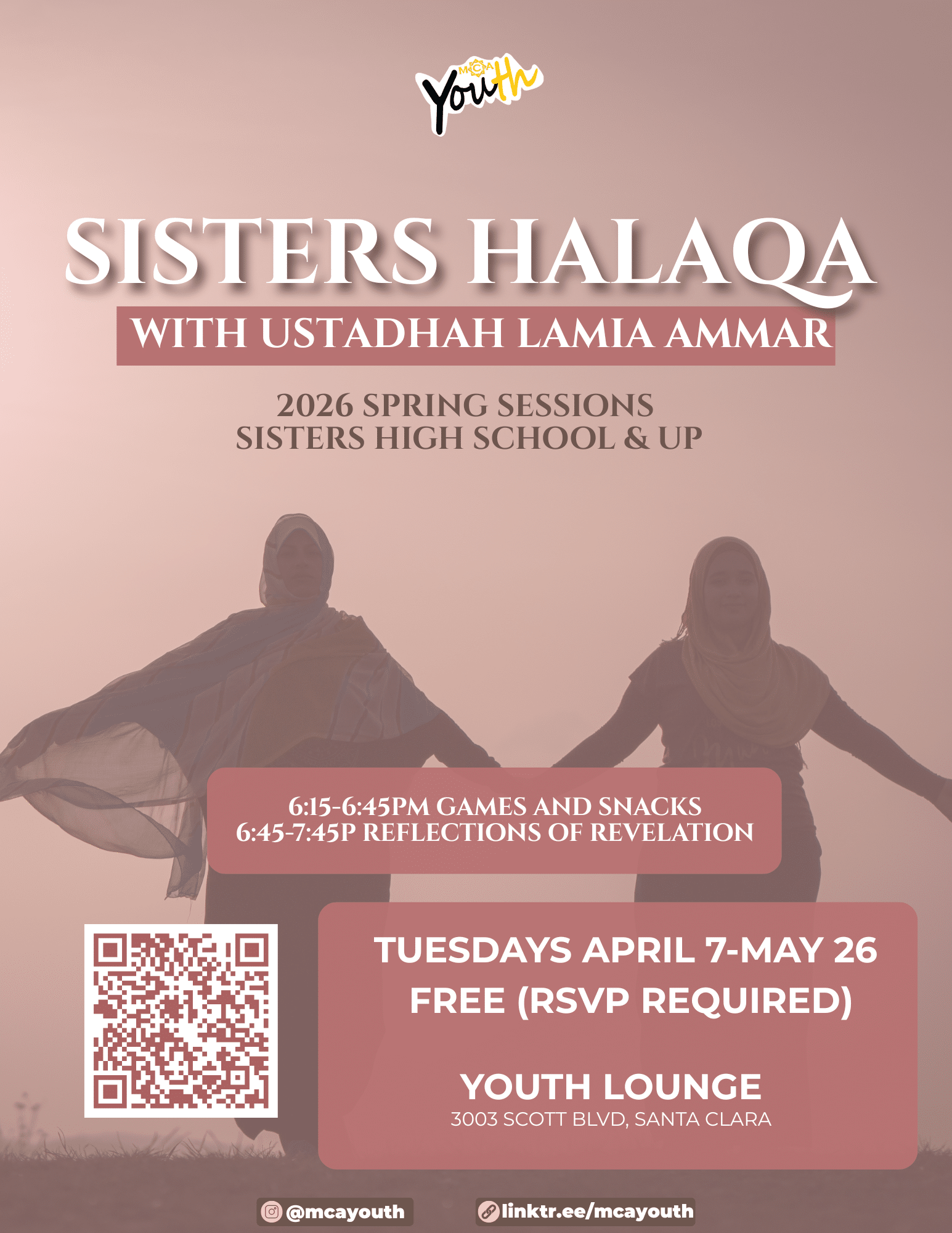 Sisters Halaqa is back this spring! Join us for a beautiful evening of connection, reflection, and sisterhood with Ustadhah Lamia Ammar. For sisters in High School and up.